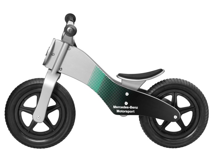 Silver-coloured / black / Petronas green. Wood, painted in Mercedes-Benz Motorsport design. 12-inch plastic wheels with rubber tyres. Adjustable seat height (approx. 32-36 cm). Age 3+.