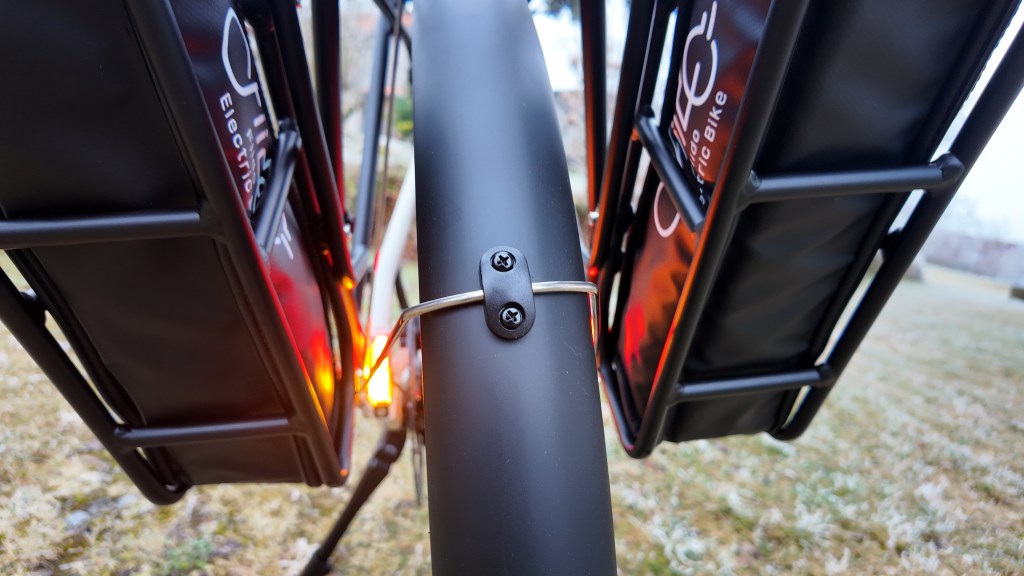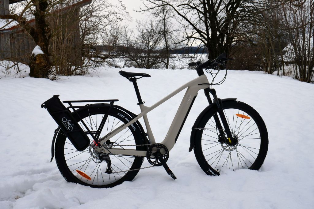 Hilfreich sind dagegen die Extra-Taste für die Schiebehilfe. Und der Schalter für die links und rechts an der hinteren Achse angebrachten Blinker – die sind eine prima Sache, allerdings verdecken die Akku-Taschen am Heck teilweise die Leuchten. Wie gewohnt ist das Nomads mit Schutzblechen, kompletter Beleuchtung, Seitenständer und Gepäckträger ausgestattet. Das mittig am Lenker platzierte Display lässt sich gut ablesen. Und auch die Tektro-Scheibenbremsen machen einen ordentlichen Job. Und ja: Eine App gibt es natürlich auch, mit deren Hilfe kann man beispielsweis auf fünf Unterstützungsstufen umschalten und sich navigieren lassen. Aber mit damit habe ich mich beim ersten Trip durch die schneebedeckte Landschaft noch nicht intensiv befasst. Das kommt später dran.