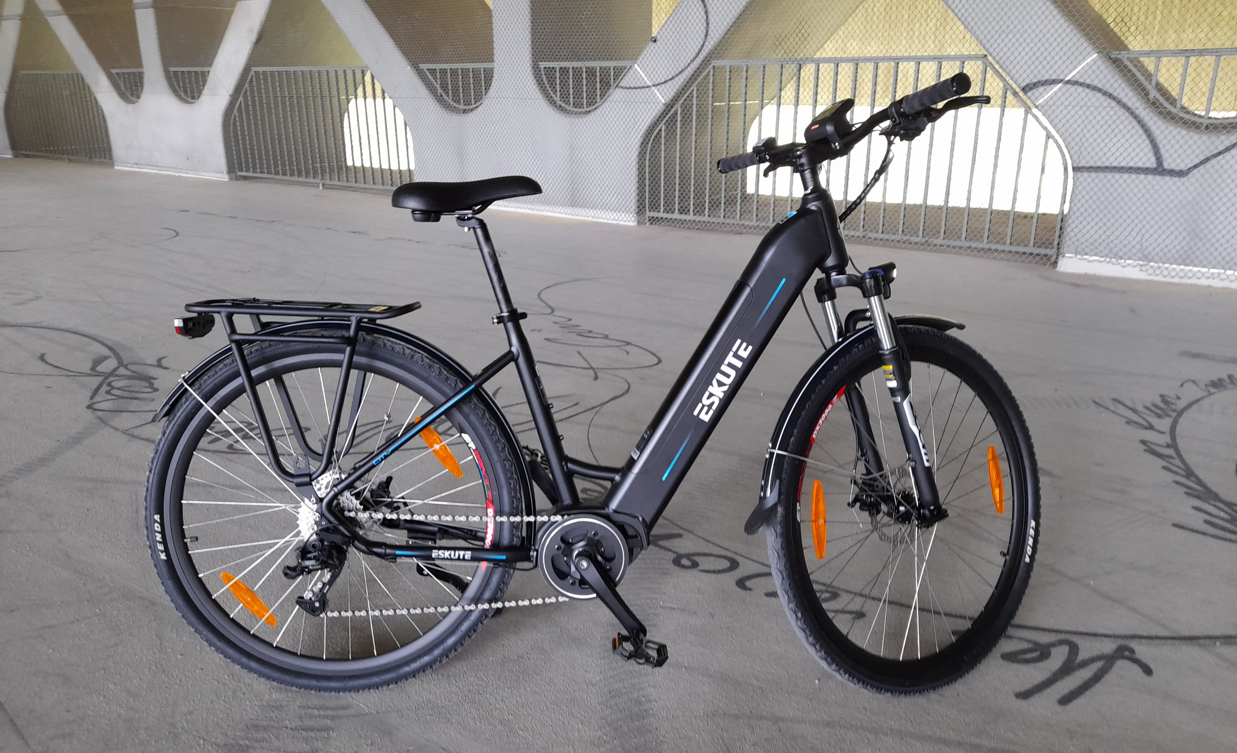 Fazit: Das Eskute Polluno Pro ist ein in sich stimmiges, angenehmes E-Bike für die Stadt und für nicht zu sportlich angehauchte Ausflüge übers Land. Der leise und geschmeidige Motor, der große Akku und die entspannte Sitzhaltung machen auch lange Touren möglich. Der Sattel könnte einen Tick mehr Komfort bieten. Übrigens: Die Zuladung beträgt sehr ordentliche 125 Kilo.